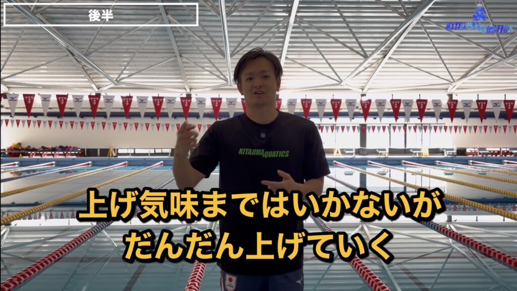 後半はテンポを徐々に上げる意識で泳ぐと、結果的に同じテンポのままラストまで泳ぎ続けることができます!